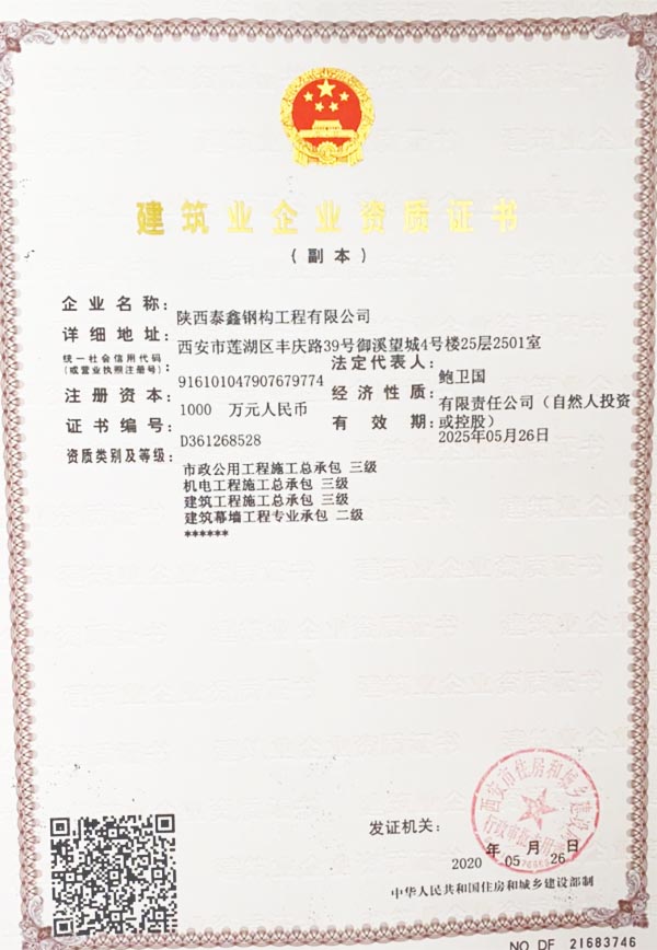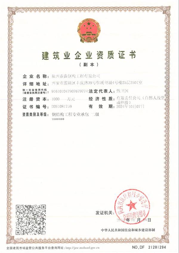 公司目前獲得資質(zhì)及證書有:鋼結(jié)構(gòu)工程專業(yè)承包二級、建筑幕墻工程專業(yè)承包二級資質(zhì)、建筑裝修裝飾工程專業(yè)承包二級、建筑工程施工總承包三級、機(jī)電工程施工總承包三級、市政公用工程施工總承包三級,安全生產(chǎn)許可證及八大員證,并連年獲得陜西省AAA級信譽(yù)單位、陜西省行業(yè)******企業(yè)等榮譽(yù)。